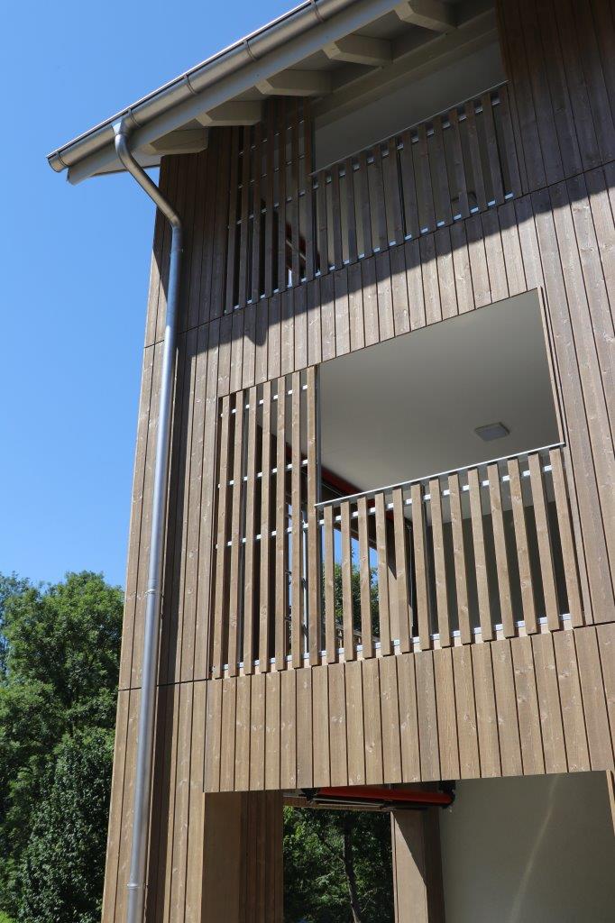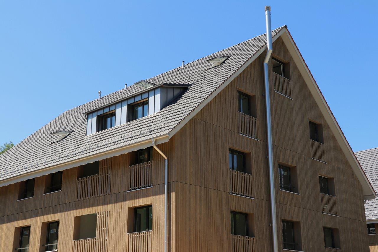 Bei diesen beiden Mehrfamilienhäusern mit insgesamt 19 Eigentumswohnungen wurde der Dachstuhl in einem konventionellen Aufbau durch uns realisiert. Im Inneren wird die Dachuntersicht mit Täfer verkleidet. Zudem wird auch die gesamte Gebäudehülle mit Holz ausgestattet.